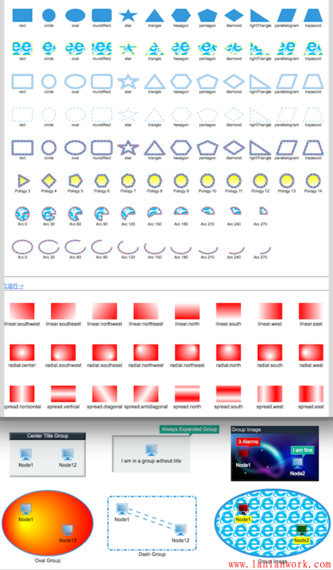 剛才的例子我們提到了一個(gè) Group 類(lèi)型,這個(gè)類(lèi)型圖元節(jié)點(diǎn)在 GraphView 上顯示成了組合效果,可雙擊展開(kāi)合并,可跟隨著孩子節(jié)點(diǎn)的位置大小變化和自適應(yīng)變動(dòng),除了 Node、Edge、Group 外,HT 還提供了 Shape、Polyline、Grid、SubGraph 等多種圖元類(lèi)型,這些圖元類(lèi)型都具是有針對(duì)性的展示效果,以滿(mǎn)足各種行業(yè)的基本圖元需求:http://www.hightopo.com/guide...