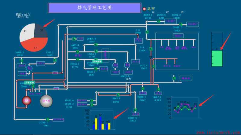 另外 HT 的矢量?jī)?nèi)置了 Chart 類(lèi)型,矢量?jī)?nèi)置的 Chart 不同于傳統(tǒng)獨(dú)立的 Chart 組件,傳統(tǒng)的 Chart 是獨(dú)立的視圖 DOM 組件,但 HT 的拓?fù)涫?Cavans 方式繪制,因此沒(méi)法實(shí)現(xiàn) Chart 組件和普通圖元的不同層次融合顯示,但矢量的 Chart 類(lèi)型倒是完美的實(shí)現(xiàn)了這樣的融合,很多工控應(yīng)用的客戶(hù)會(huì)將矢量 Chart 與拓?fù)鋱D元素融合一體,可參見(jiàn)《基于HT for Web的Web SCADA工控移動(dòng)應(yīng)用》http://www.hightopo.com/blog/... 一文中 HT 的 Web SCADA 應(yīng)用案例