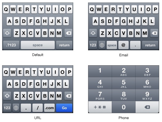 - 智能手機(jī)的系統(tǒng)平臺(tái)當(dāng)中通常都會(huì)內(nèi)置一些針對(duì)不同類型內(nèi)容的鍵盤,例如文本、數(shù)字、Email、URL等。在你的應(yīng)用中,確保針對(duì)不同的內(nèi)容類型使用對(duì)應(yīng)的鍵盤,提升用戶輸入的效率。