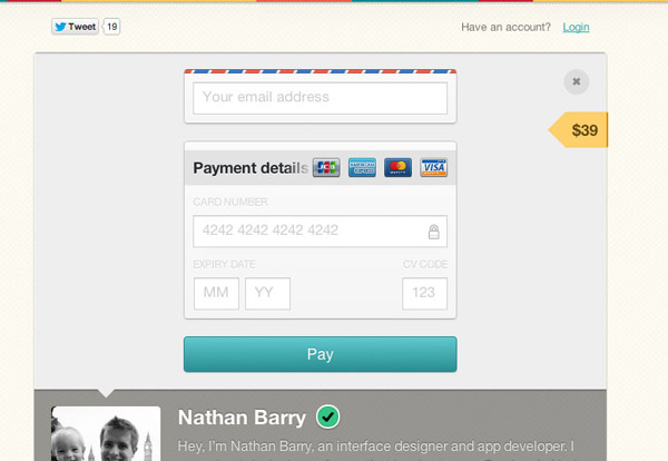 Gumroad在未登錄狀態(tài)的支付表單中剔除了很多常見(jiàn)的“必填”字段,最終只保留了用于輸入郵箱地址、信用卡號(hào)、有效期和CV碼的文本框。如果連未登錄時(shí)的支付環(huán)節(jié)都可以被如此簡(jiǎn)化,我相信對(duì)于其他方面業(yè)務(wù)的那些復(fù)雜表單來(lái)說(shuō),不會(huì)沒(méi)有優(yōu)化空間的。