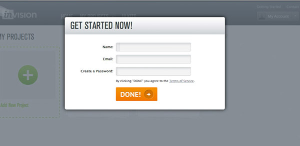 在對(duì)表單進(jìn)行了充分的簡(jiǎn)化之后,我們還可以試著通過(guò)一些設(shè)計(jì)技巧讓填寫(xiě)表單的環(huán)節(jié)看上去更輕量。在這方面,我個(gè)人最喜歡的一個(gè)案例來(lái)自原型制作工具InVision的注冊(cè)表單。他們使用浮層的形式呈現(xiàn)表單,作為訪問(wèn)者,我可以感知到,當(dāng)我填寫(xiě)完成之后就可以立刻回到之前的界面繼續(xù)應(yīng)用流程。