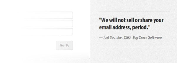 在為訪問(wèn)者提供積極引導(dǎo)的同時(shí),我們還要想辦法避免掉那些負(fù)面因素。人們?cè)谔顚?xiě)表單時(shí)的最大顧慮就是信息被網(wǎng)站方收集之后的用途。用戶不會(huì)希望收到垃圾郵件,更不愿意自己的個(gè)人信息被傳播出去。如果你確實(shí)運(yùn)營(yíng)著一個(gè)值得信賴的產(chǎn)品,那么不妨直接讓用戶知道你不會(huì)把他們的信息販賣(mài)出去或是向他們發(fā)送垃圾郵件,就像FogBugz做的那樣,在注冊(cè)表單旁邊以非常直白的口語(yǔ)化的方式告訴用戶“我們不會(huì)出售或分享你的郵箱地址,就是這樣。”