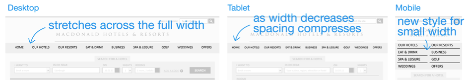 我們將使用一個(gè)真實(shí)的酒店網(wǎng)站 作為范例,來演示響應(yīng)式Web設(shè)計(jì)的流程。這個(gè)網(wǎng)站是我們?cè)诰旁路輨倓倿镸acdonald連鎖酒店創(chuàng)建的。在整個(gè)設(shè)計(jì)開發(fā)流程中,有幾個(gè)關(guān)鍵步驟,是我們接下來要逐一展開學(xué)習(xí)的: