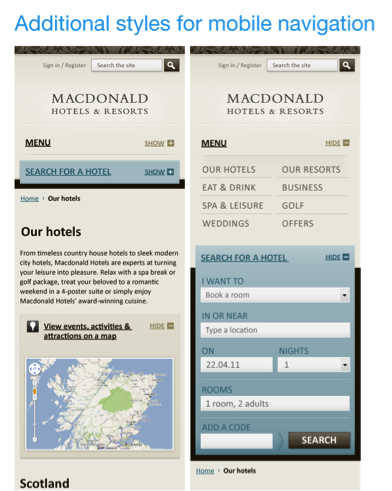 相比于傳統(tǒng)的Web視覺設(shè)計(jì)過程,在這里我們不僅要打造出風(fēng)格恰當(dāng)?shù)腢I元素,而且要根據(jù)前面制定下來的幾種規(guī)格方案,對(duì)某些關(guān)鍵性的UI元素進(jìn)行樣式擴(kuò)展或改造。例如下圖所示的酒店搜索模塊,正如我們前面提到的,在小屏幕版本中,最佳實(shí)踐方式是做成可展開和收起的模式,而這種交互方式在平板電腦或桌面設(shè)備中是不需要的。類似這樣情況,在視覺設(shè)計(jì)方面需要花些額外的功夫。