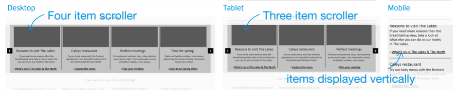 全局的四列等寬網(wǎng)格布局使其他組件的規(guī)劃也非常輕松。在首頁中有一個(gè)組件,其中包含若干內(nèi)容模塊。默認(rèn)尺寸下,可以并排顯示四個(gè)模塊;左右兩邊各有一個(gè)觸發(fā)滾動(dòng)的按鈕,以點(diǎn)擊之后模塊列表會(huì)前后滾動(dòng),以顯示更多內(nèi)容。在平板電腦類型的布局中,默認(rèn)顯示的數(shù)量變?yōu)槿齻€(gè);而在手機(jī)的小尺寸屏幕中,內(nèi)容模塊列表會(huì)變?yōu)閱瘟校⑷サ袅擞糜谧笥覞L動(dòng)的按鈕,用戶可以上下滾動(dòng)頁面,依次查看不同的模塊。