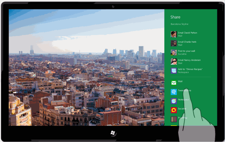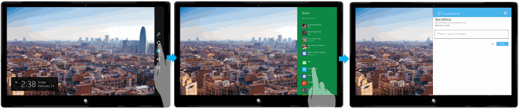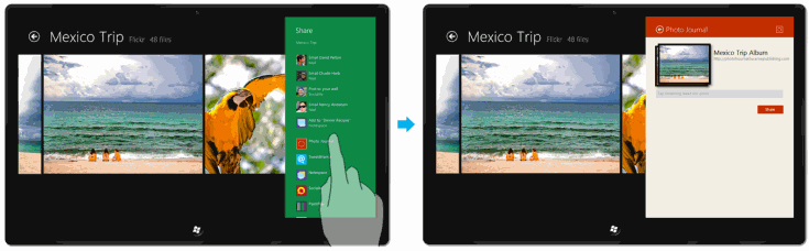 而在Metro風(fēng)格的應(yīng)用當(dāng)中,我們會使用分享契約 。這種技術(shù)方案簡化了設(shè)計與開發(fā)方面的工作,因為我們不需要為用戶有可能用到的社會化服務(wù)而將它們與每個單獨的應(yīng)用都逐一整合起來。不僅是社會化服務(wù),用戶還可以將信息保存共享至平臺上所有那些使用了分享契約的應(yīng)用,而開發(fā)者們則無需擔(dān)心外部服務(wù)的接口問題。站在用戶的角度,他們可以在charms bar這個固定的地方完成有關(guān)分享的操作。