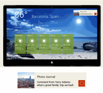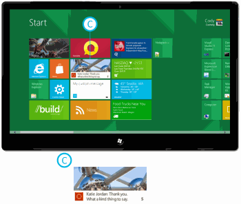 而Windows 8中的瓦片則整合了通知中心與數(shù)字標(biāo)識這兩個方面的提示功能,用戶即可以直接在瓦片中閱讀提示信息,也可以點擊進入應(yīng)用。另外,與iOS通知中心統(tǒng)一化的輸出格式有所不同,Metro風(fēng)格的應(yīng)用瓦片允許設(shè)計師從大量模板當(dāng)中選擇不同的樣式。