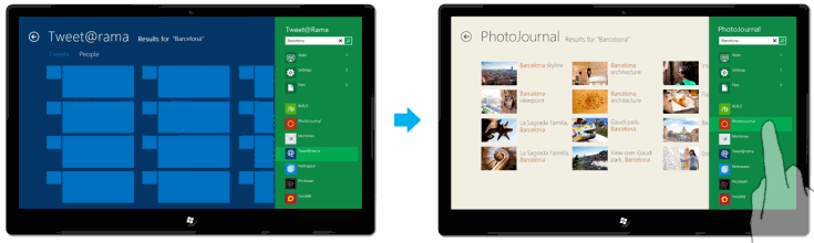 如上圖所示,用戶當(dāng)前處于Tweet@Rama 應(yīng)用的環(huán)境當(dāng)中,出于某種需求,該用戶希望搜索相片應(yīng)用當(dāng)中所有包含“Barcelona”關(guān)鍵詞的相片。輸入了關(guān)鍵詞之后,用戶在搜索托盤中選擇相片應(yīng)用,使其成為搜索結(jié)果提供者,這時相片應(yīng)用就會自動加載,并顯示相關(guān)的搜索結(jié)果。這種方式使得用戶無需手動在當(dāng)前運行的應(yīng)用與搜索目標(biāo)應(yīng)用之間進行切換。