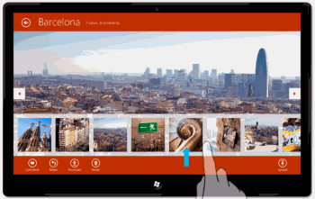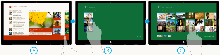 無論在iOS還是Windows中,這兩個手勢在很多時候都被用作放大或縮小內(nèi)容對象的尺寸。不過對于Metro應(yīng)用來說,它們還可以通過Semantic Zoom來實現(xiàn)內(nèi)容層級間的導(dǎo)航。用戶可以捏合某個內(nèi)容對象,來進入它所在的相關(guān)內(nèi)容組。不過,當(dāng)用戶正在以全屏模式瀏覽單張相片的時候,捏合與張開的手勢還是會被用來調(diào)整圖片的尺寸。