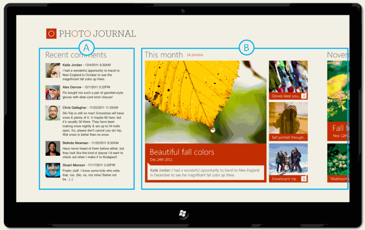 在iPad應(yīng)用中,設(shè)計師通常需要考慮兩種屏幕定向方式以及對應(yīng)的界面設(shè)計方案。而Windows 8可以運行在多種設(shè)備上,包括平板和臺式機。因此,我們要考慮到顯示空間更大的情況,讓用戶在大尺寸設(shè)備中能夠看到更多的內(nèi)容。網(wǎng)格布局可以使設(shè)計方案更好的適應(yīng)于不同的屏幕定向方式及不同類型的顯示設(shè)備,例如針對縱向空間更大的設(shè)備來顯示更多的當(dāng)月特色圖片。