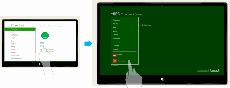 如上圖所示,用戶在PC Settings界面中點擊“瀏覽”,以更換頭像圖片。由于我們的相片日志應(yīng)用支持文件選擇器契約,所以在接下來的文件選擇界面中,就會看到應(yīng)用名稱出現(xiàn)在列表當(dāng)中,用戶可以選擇該應(yīng)用當(dāng)中存儲的相片作為新的頭像。