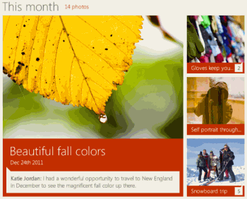 兩個版本都會按照月份次序來組織內(nèi)容,不過對于月份的表現(xiàn)方式有所差異。在iPad版本中,相片會根據(jù)上傳月份的不同而被劃分到12個區(qū)塊當(dāng)中。在Metro版本中,我們傾向于以更加直接的方式呈現(xiàn)出更多的相片及社交方面的信息,使用戶對內(nèi)容的上下文環(huán)境具有更強的認知。