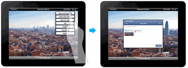 iPad版本:用戶需要點擊導(dǎo)航欄右側(cè)的相關(guān)動作按鈕,并從展開的列表中選擇“分享到Facebook”。如果要使應(yīng)用支持更多的分享服務(wù),開發(fā)人員必須在該應(yīng)用當(dāng)中逐一增添。