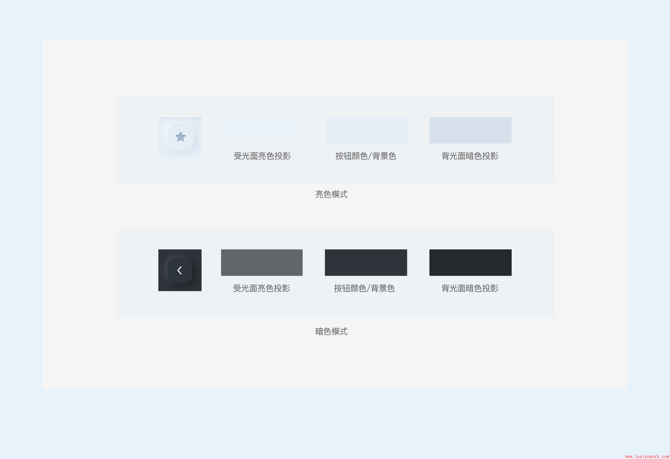 這里就要講一下,另一個(gè)叫法了soft ui,即軟ui。軟,有柔和的意思。為什么這么命名呢?其實(shí)就是由于新擬態(tài)的組件與背景的對比度很弱,我把收集到的幾千張素材中,挑選一部分進(jìn)行進(jìn)行色值對比,可以發(fā)現(xiàn)無論是亮色模式下和暗色模式下對比度都是很低的。