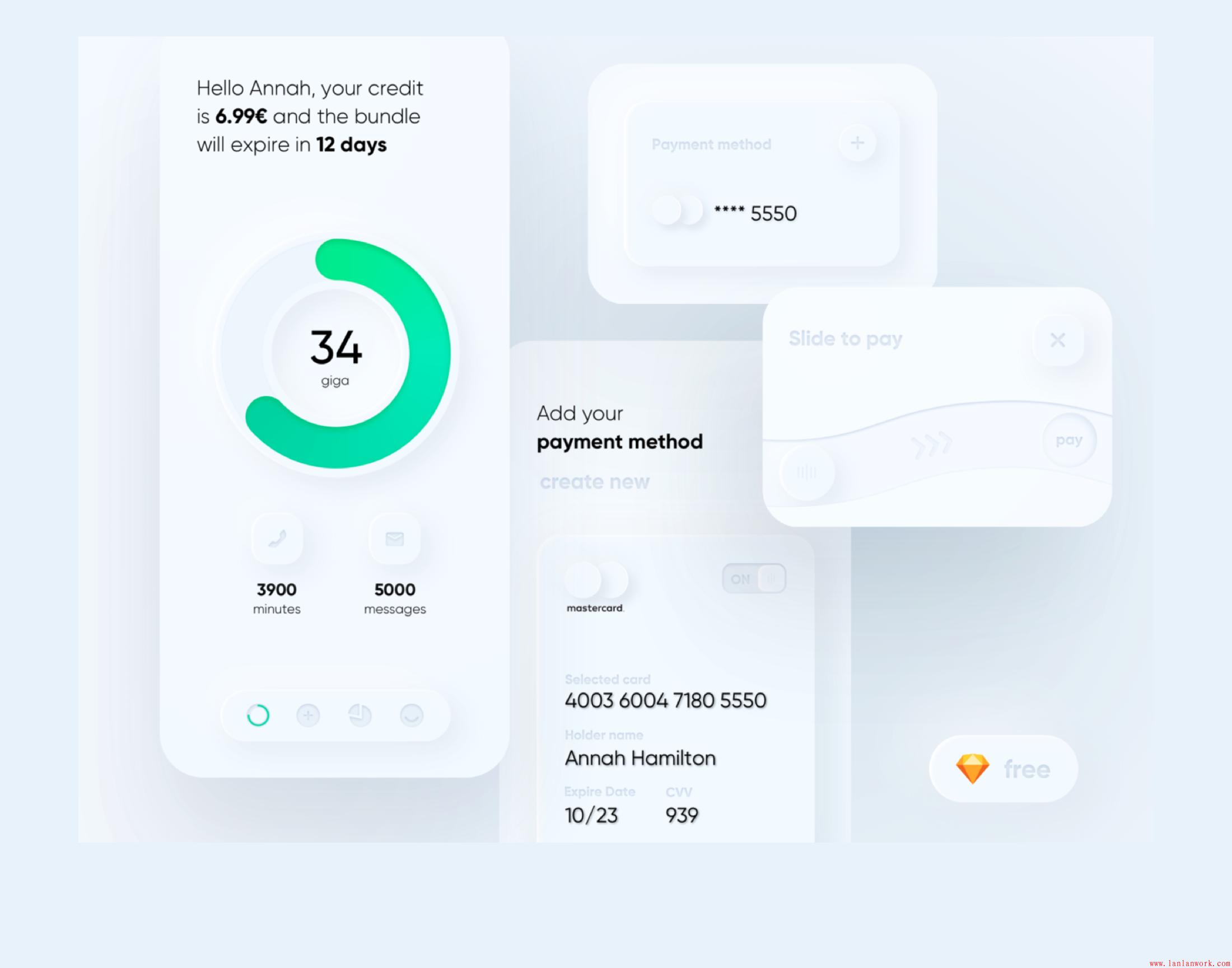 這樣做的好處不單單是為了體現(xiàn)卡片的厚度,因?yàn)槲覀兦懊嬷v到,新擬態(tài)是軟ui,是對比很弱的。風(fēng)格柔和帶來的另個(gè)一個(gè)不太好的就是,界面清晰度不夠,很容易把視覺處理“糊掉”。所以,增加對角漸變描邊在一定程度上也起到了,讓界面的視覺層級更加清新的作用。在實(shí)操部分,將會(huì)一一拆解各種情況的一些處理方式。