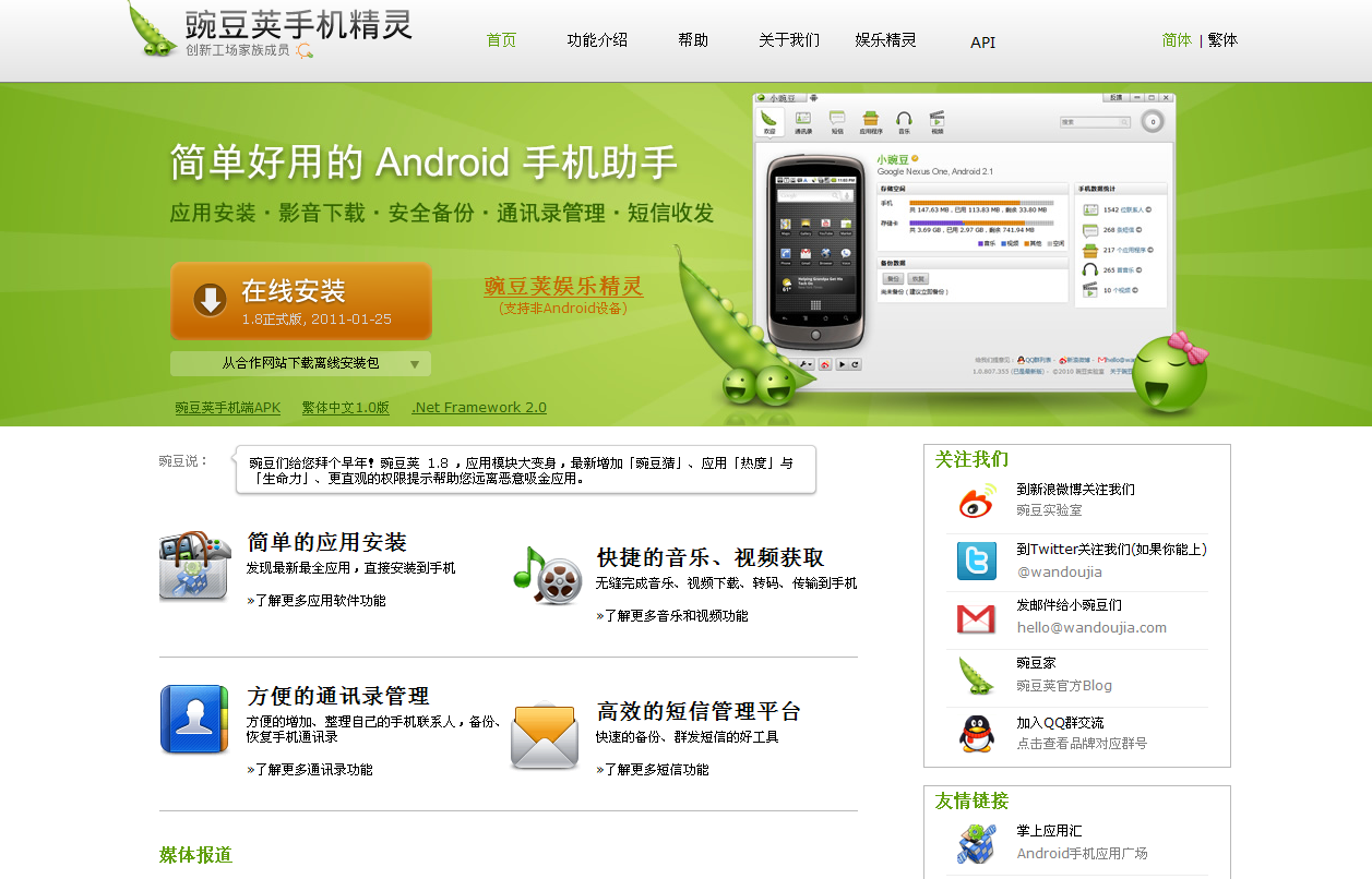 舊版和新版,適合了不同時期豌豆莢手機精靈推廣的需要。當(dāng)拓展開市場之后,產(chǎn)品就要好的足以打動人,吸引不斷的去下載、使用,蘋果的網(wǎng)站也是如此。化繁為簡,至道無難。