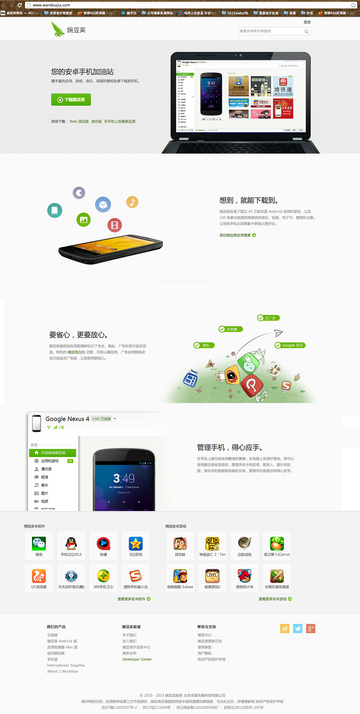 6改版后的豌豆莢手機精靈官網(wǎng)http://www.wandoujia.com/,極簡主義,該突出的重點“軟件界面圖片”更大更顯眼,去掉了任何多余的東西,下載按鈕顯的更萬灰眾中一點綠,更易找到,增加轉(zhuǎn)化率。