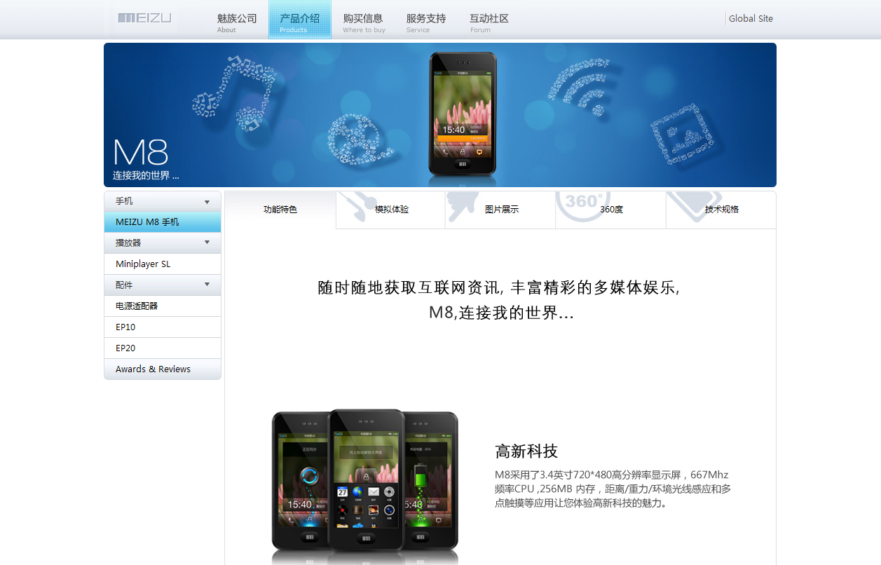 4 魅族公司官網(wǎng),也是藍藍個人非常喜歡的風(fēng)格,格局大方,恢宏穩(wěn)重,沒有多余的東西,極簡單而條理清晰,重點的圖設(shè)計精致、表達需求明確,而且唯美,大量空白顯的頁面不擁擠,有想象的空間。