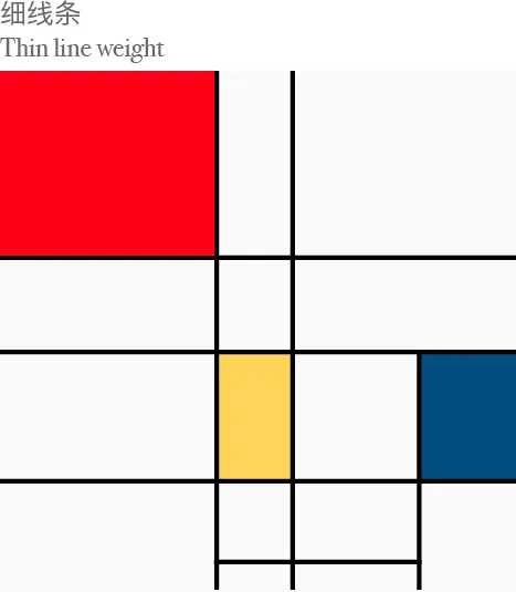 serif字體本身的線條的粗細變化和平衡就跟中國書法一樣,好的書法作品是不可能每條線都一樣粗細,一定是交織的平衡。人類的視覺本身對不同線寬的交錯就有著美的感覺。比如下圖最左邊是蒙德里安在”新造形主義”﹝Neo-Plasticism﹞里的作品,其中每個交叉的線條都有著不同的粗細。如果將同樣這幅畫的線條變成同等粗細,那這件作品的性格就淡了。同樣根據(jù)人自然的審美觀,細線條比粗線條要美,比較第二和第三張就能看出來