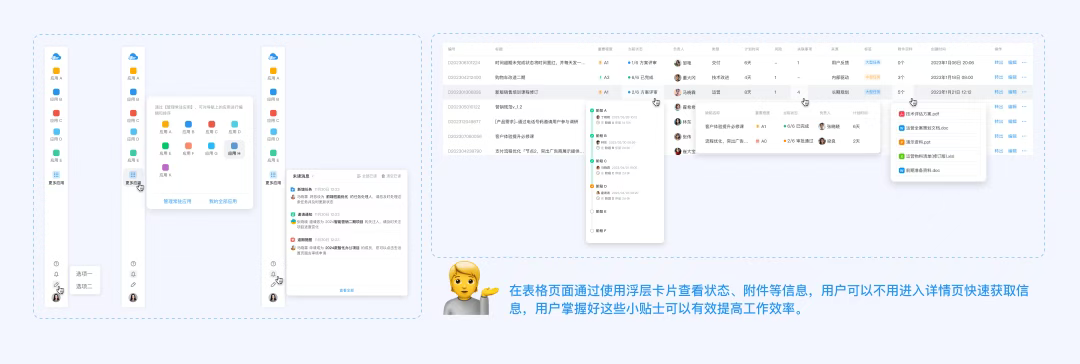 在表格頁面通過使用【浮層卡片】查看狀態(tài)、附件等信息,用戶可以不用進入詳情頁快速獲取信息,用戶掌握好這些小貼士可以有效提高工作效率。