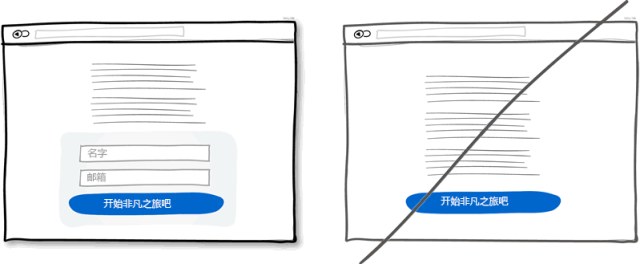在一個足夠大的寬屏界面上最好還是直接給出表單,這比點擊按鈕再彈出表單要好很多。首先減少了點擊操作,流程變得簡潔也節(jié)省了時間。其次,直接呈現(xiàn)出表單可以讓用戶知道表單有多長,其實也是在告訴用戶注冊花不了多少時間。當然,這條規(guī)則適合注冊表單非常簡單的情況。