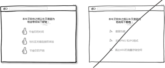 市場就是這樣的,用戶永遠只關心自身利益而產(chǎn)品特性對他們來說倒不是那么重要。只有利益才更直觀地體現(xiàn)出使用產(chǎn)品所帶來的價值。Chris Guillebeau在他的著作《100美元起家》中指出,相比壓力,沖突,煩心事和未知的未來,人們在乎得更多的是愛,金錢,認同感和自由支配的空閑時間。所以我相信在展示產(chǎn)品特性時回歸到利益上是必要的。