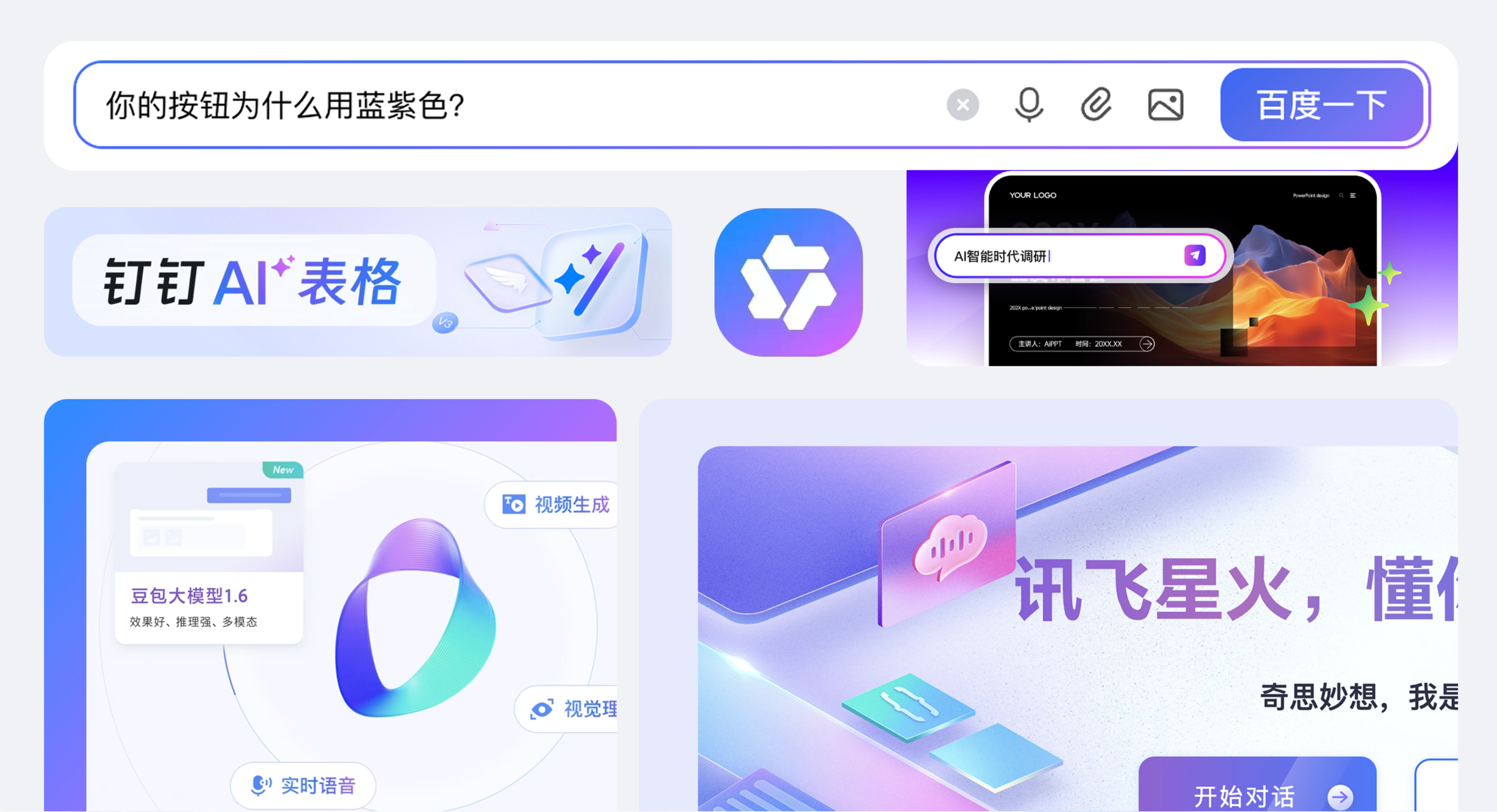 打開手機(jī)里的各類 AI 應(yīng)用,你大概率會(huì)被一種藍(lán)紫色調(diào) “包圍”:通義 APP 的 logo、百度的問 AI 按鈕、釘釘?shù)?AI 表格圖標(biāo)、訊飛星火的官網(wǎng) banner……