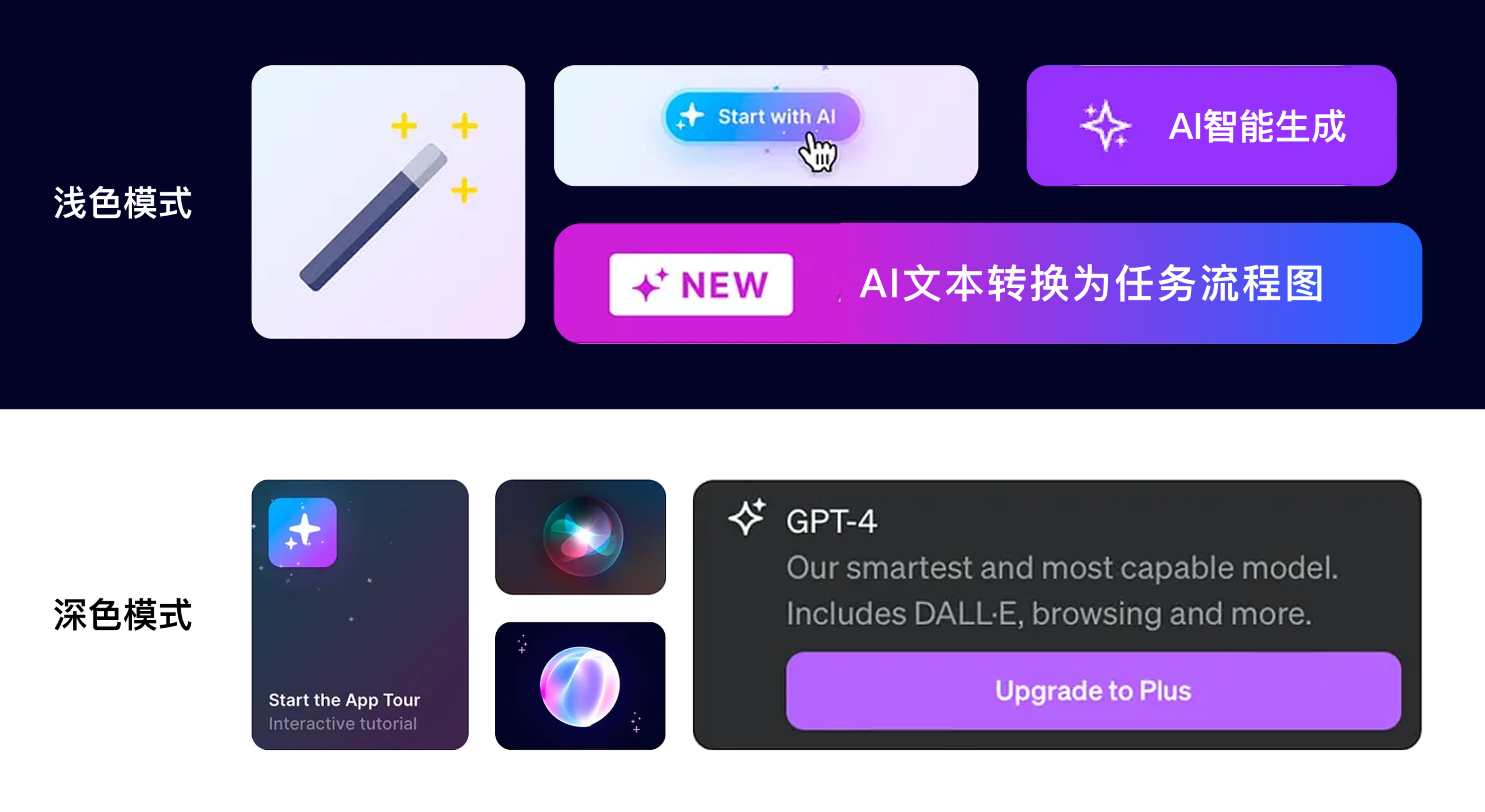 但僅靠藍(lán)色遠(yuǎn)遠(yuǎn)不夠,AI 功能還需凸顯 “新意”,避免陷入傳統(tǒng)科技產(chǎn)品的沉悶感。此時(shí)紫色的加入,恰好補(bǔ)上了 “創(chuàng)新感” 的缺口:紫色由藍(lán)色與紅色調(diào)和而成,既保留了藍(lán)色的理性穩(wěn)重,又融入了紅色的活力,卻無紅色的刺眼感,比藍(lán)色多了幾分創(chuàng)造力與神秘感。