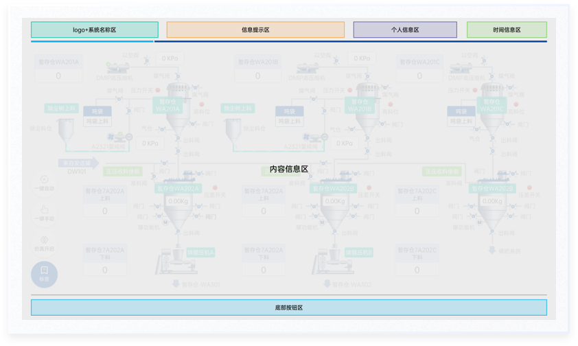 依據(jù)行業(yè)屬性和交互方式,使用環(huán)境的分析結(jié)果,對(duì)界面區(qū)域進(jìn)行了相應(yīng)的劃分,通過區(qū)域的大小和顏色區(qū)分信息的重要程度,主要信息+輔助信息,以結(jié)構(gòu)化的方式像用戶輸出多維信息,讓用戶直觀全面獲取信息,為決策和操作提供依據(jù)。