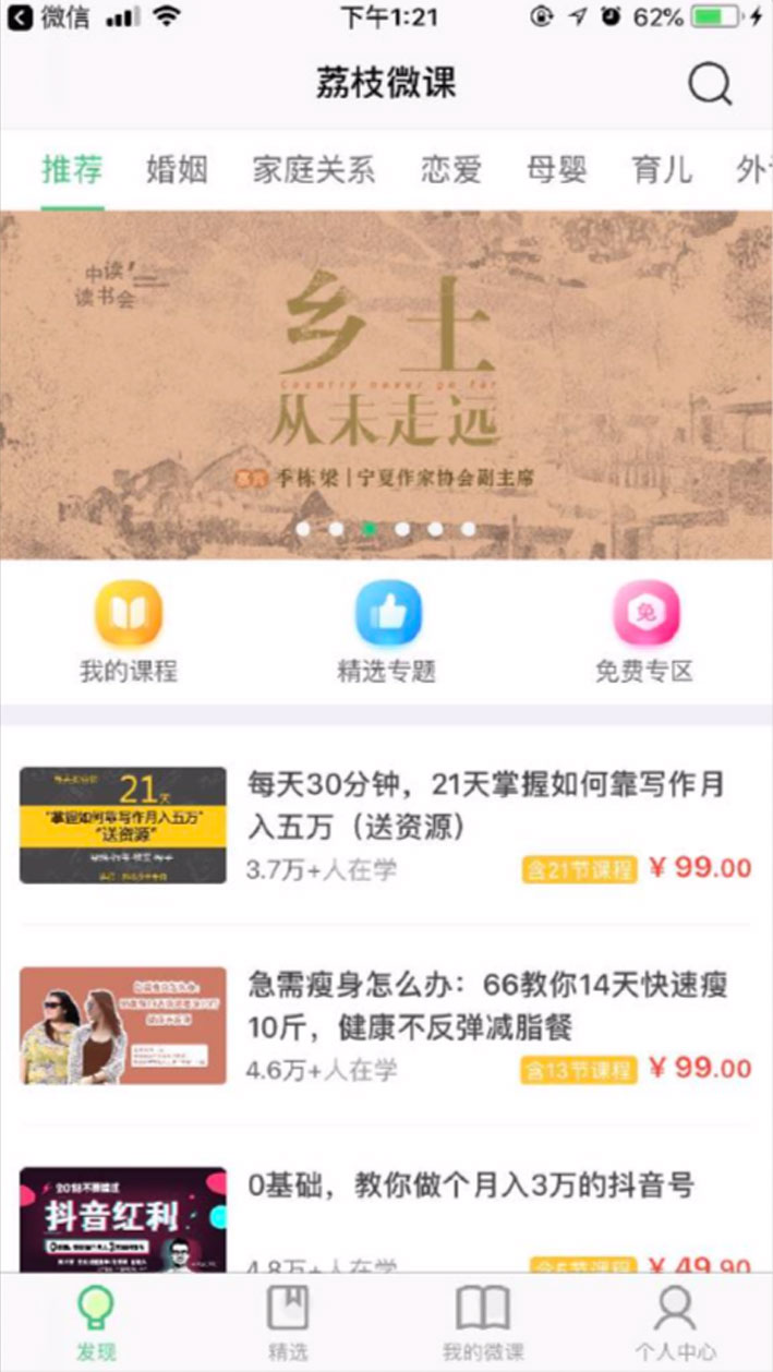 3.中間以三個(gè)圖標(biāo)按鈕表示我的課程,精選專題,免費(fèi)專區(qū)快捷入口方便用戶來(lái)回 切換;