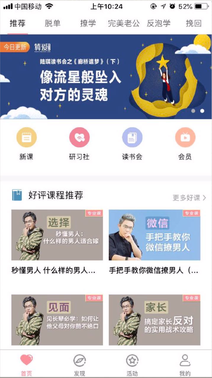 1.首頁(yè)根據(jù)產(chǎn)品的不同特色,設(shè)置了二級(jí)導(dǎo)航,將、脫單、撩學(xué)、完美老公、 反泡學(xué)、挽回等分類作為二級(jí)導(dǎo)航標(biāo)題,既能用來(lái)統(tǒng)一呈現(xiàn)特色內(nèi)容,又能保證頁(yè) 面信息的層級(jí)關(guān)系清晰明了;
