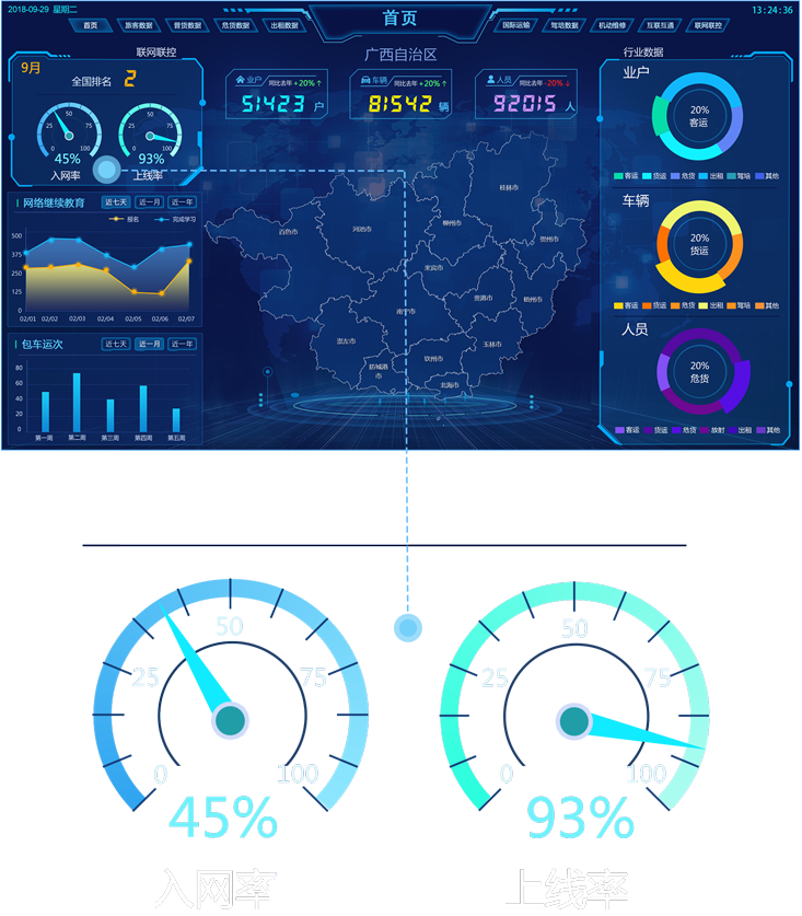 儀表盤:入網(wǎng)率和上線率用儀表盤的形式來展示,整體增加了整個頁面的科技感。兩個儀表盤 分別采用藍(lán)、青兩種比較亮的顏色同是也有輕微的漸變。儀表盤沒有全部封閉,下邊由數(shù)字顯示當(dāng) 前具體的百分比。